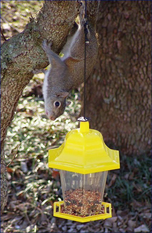 Feb. 17th, 2008 08:00 pmМы повесили кормушку. Специально повесили так, чтобы белка не достала. Но она достала! Вот так она повисает на задних лапах, дожидается, когда порывом ветра кормушку качнет в ее сторону (а может уже догадалась дергать за веревочку, чтобы кормушка начала качаться), дотягивается, цепляет лапой и вися по-моему чуть ли не на одном хвосте выковыривает из кормушки семечки. Все остальное летит на землю. Птицы правда не жалуются.